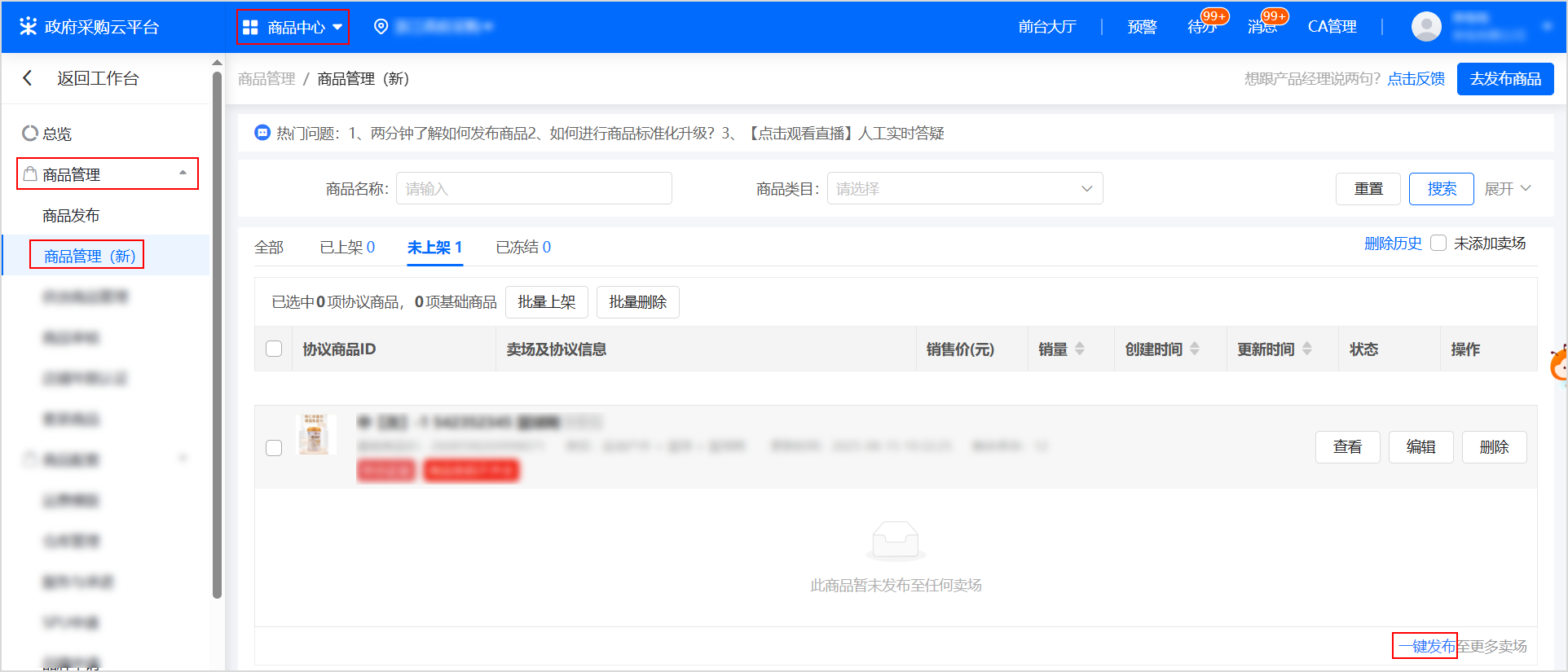 在 未上架 标签页,选择需要上架的商品,点击 一键发布。
