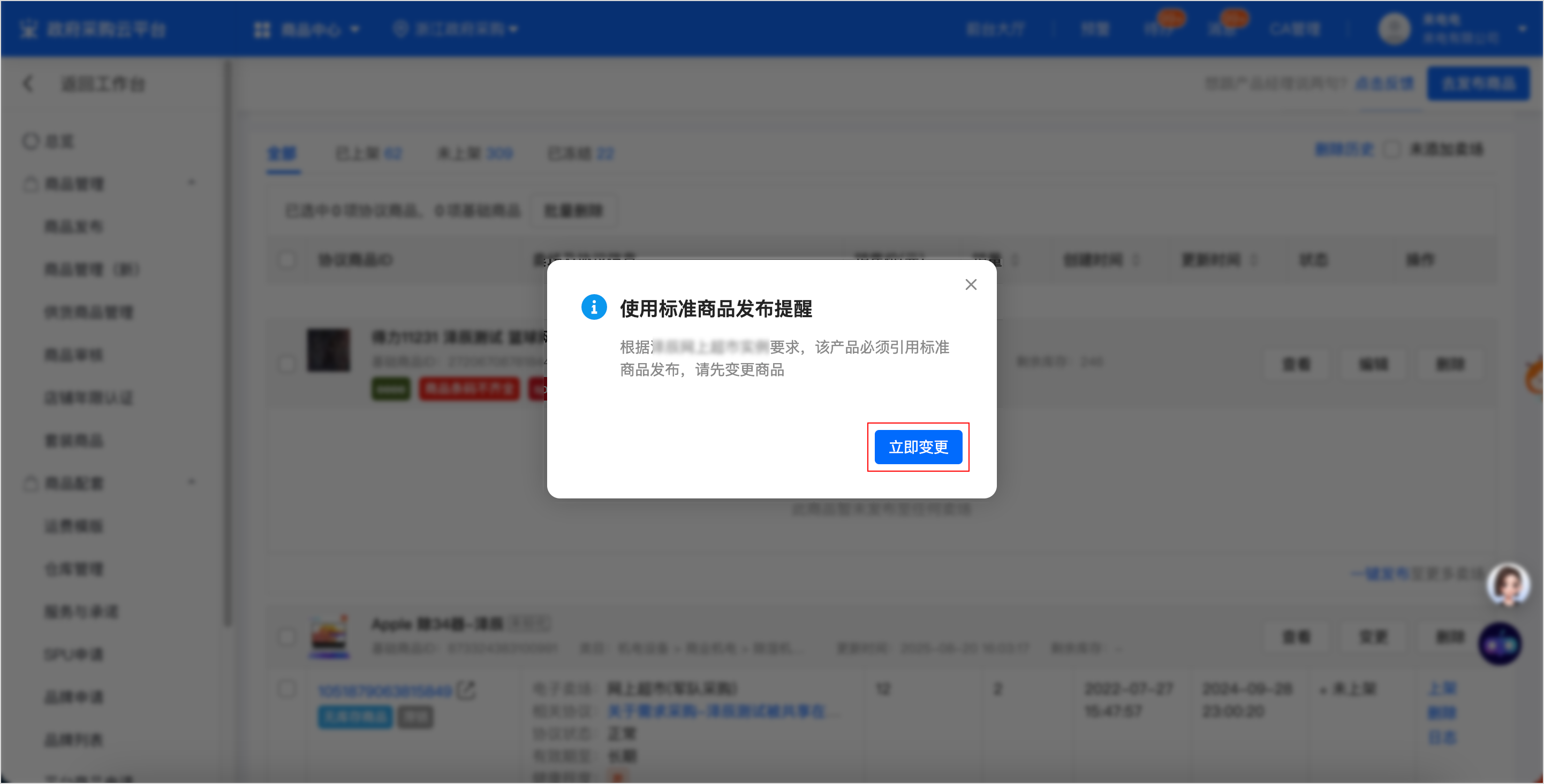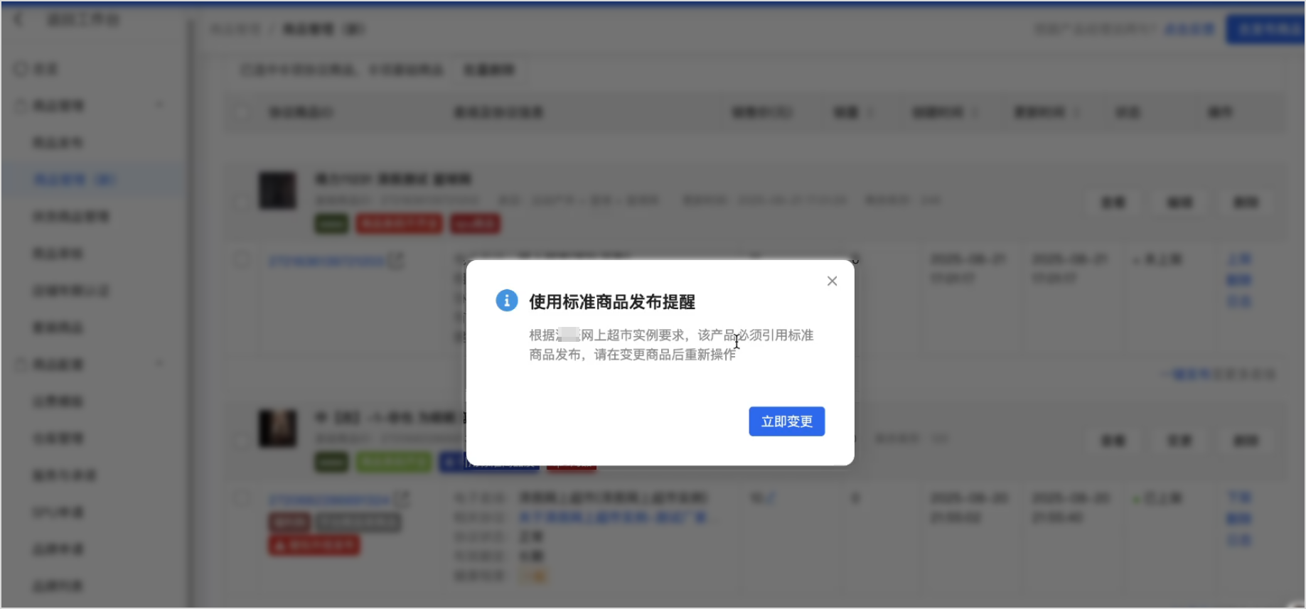 提示:根据该卖场要求,该产品必须引用标准商品发布,请先变更商品后重新操作。点击 立即变更,按标准商品编辑并进行提交后,返回 商品管理 页面重新选择卖场并执行发布,商品才会成功上架。