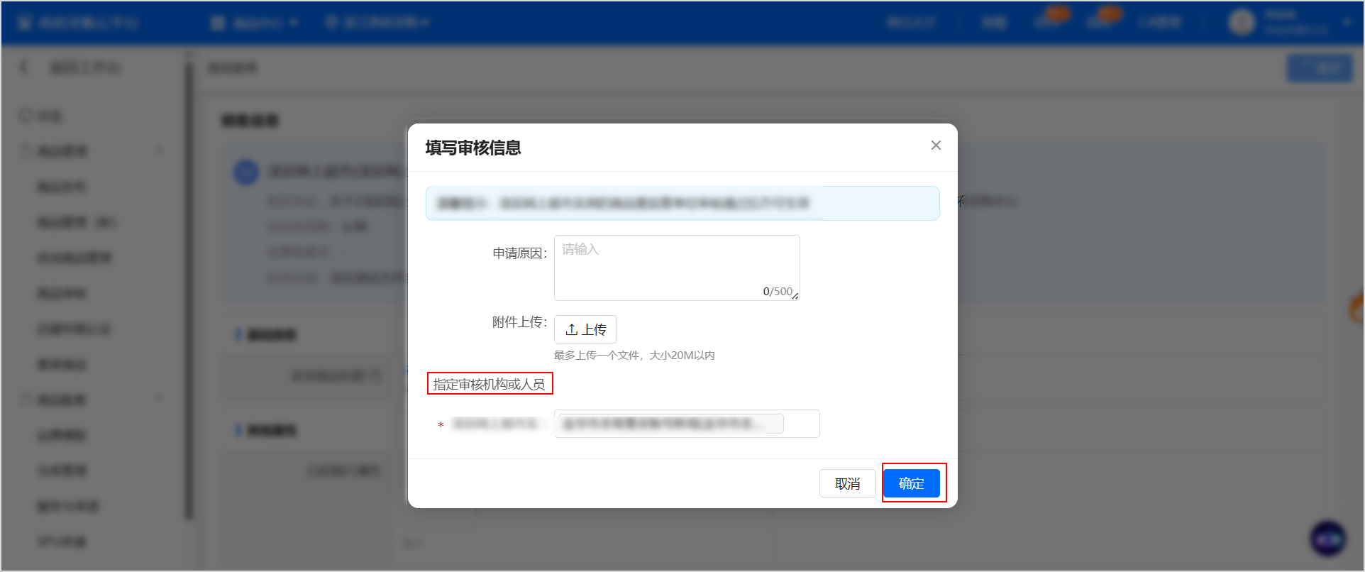 在 填写审核信息 弹窗中,选择 指定审核机构或人员,点击 确定。