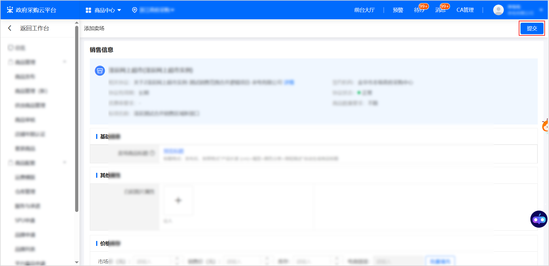 基础商品引用平台标准商品,则进入 添加卖场 页面,点击 提交。