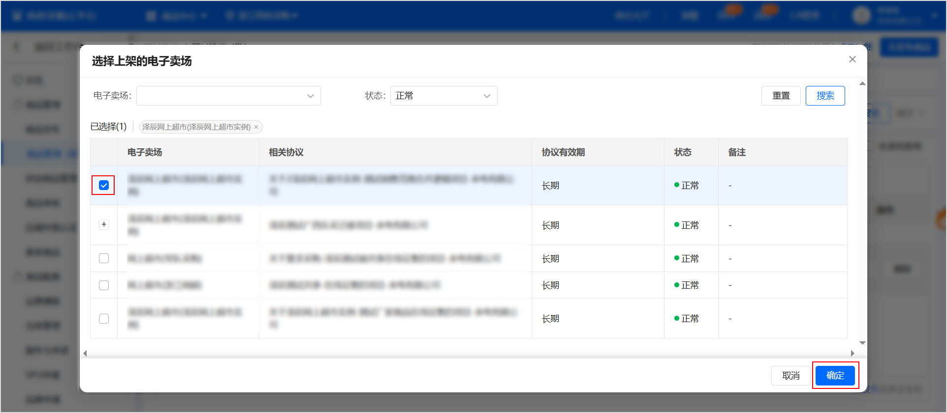 在 选择上架的电子卖场 弹窗中,选择卖场,点击 确定。